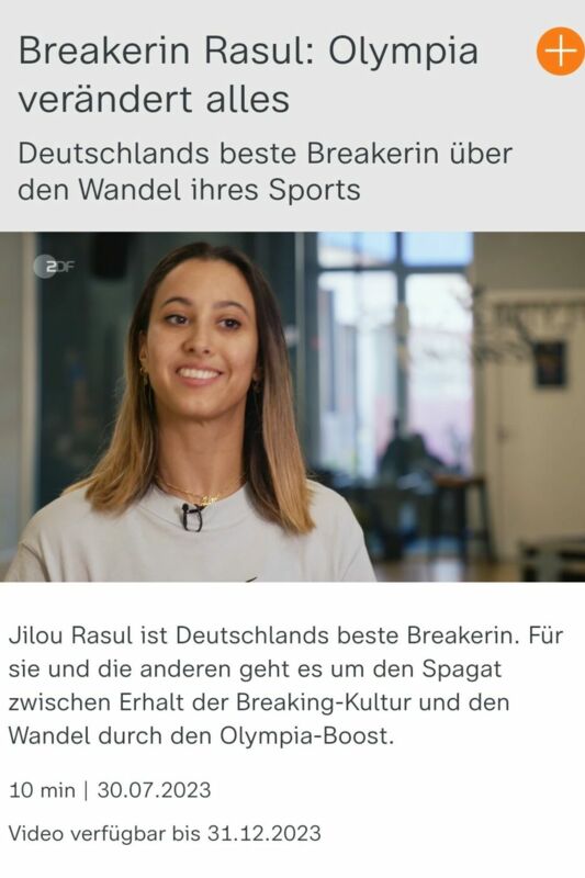 Jilou Rasul ist Deutschlands beste Breakerin. Für sie und die anderen geht es um den Spagat zwischen Erhalt der Breaking-Kultur und den Wandel durch den Olympia-Boost. Das ZDF hat die Berlinerin portraitiert. Der zehnminütige Bericht ist im Sommer rund um die EM in Spanien und die Finals in Duisburg entstanden.