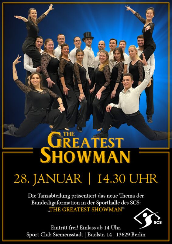 Wer die neue Choreographie und Musik "The Greatest Showman" kennenlernen möchte, ist herzlich eingeladen zur Präsentation am kommenden Sonntag (28. Januar). Ab 14: 30 Uhr (Einlass ab 14:00 Uhr) in der Sporthalle des Sport Centrum Siemensstadt (Buolstr. 14, 13629 Berlin).