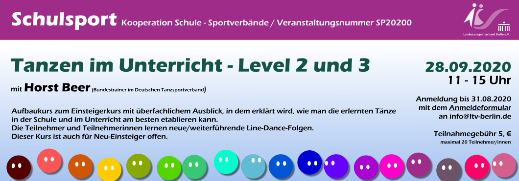 Am kommenden Montag (28. September) gibt es eine weitere Lehrerfortbildung mit u.a. unserem Bundes- und Landestrainer (Latein) Horst Beer. Dieser Lehrgang (Aufbaukurs) baut auf dem Einsteigerkurs mit überfachlichem Ausblick auf, in dem erklärt wird, wie man die erlernten Tänze in der Schule und im Unterricht am besten etablieren kann.