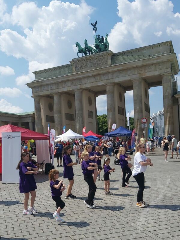 1a-Lage für die LTV-Tanzfläche beim LSB-Familiensportfest - unter den Augen der Quadriga auf dem Brandenburger Tor und zentral auf dem Pariser Platz. Und so kamen alle vorbei - Sportsenatorin Iris Spranger, Bildungsenatorin Katharina Günther-Wünsch, LSB-Präsident Thomas Härtel, Sportjugend-Vorsitzender Christian Krull und auch Weltspiele-Maskottchen Unity. Stets wurde was geboten...von Schulgruppen der Möwensee-Grundschule, Kindergruppen des SC Siemensstadt, orientalische Tänzerinnen des Rot-Gold, die Nachwuchspaare des btc Grün-Gold und die Hobbypaare des Blinden- und Sehbehindertenvereins.