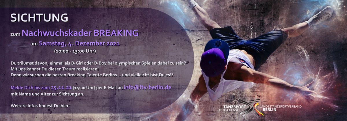 Die Teilnahme am Sichtungstraining ist einzig nach vorheriger Anmeldung und Bestätigung durch den Landestanzsportverband Berlin möglich. Bei Fragen zum Sichtungstraining ist der LTV-Landestrainer Breaking, Michael Rosemann, per E-Mail unter breaking@ltv-berlin.de erreichbar.