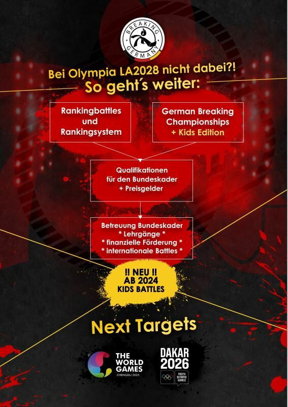 Der DTV wird deutschlandweit weiterhin für Breaking als Disziplin im organisierten Sport verantwortlich sein. Neue Zielwettkämpfe sind die World Games 2025 sowie die Youth Olympic Games 2026.