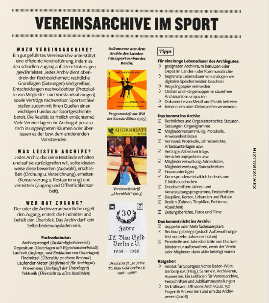 Auf Anregung und auf Basis von Informationen des LTV-Berlin-Archivars, Dirk Ullmann, greift die aktuelle Ausgabe von "Sport in Berlin" das Thema Vereinsarchive im Sport auf. Der Beitrag im Magazin des Landessportbund Berlin ist durch Archivbestände des Berliner Tanzsport illustriert.