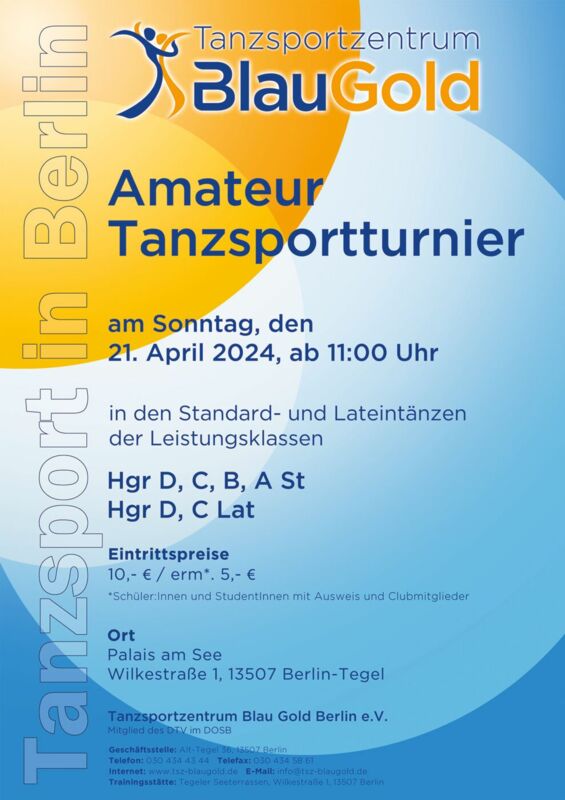 Aufgrund der Startmeldungen ergeben sich für die Turniere beim Tanzsportzentrum Blau Gold im Palais am See am kommenden Sonntag (21. April 2024) die folgenden Startzeiten: