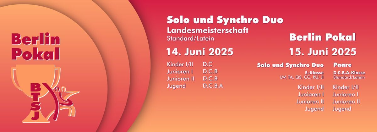 Nach Meldeschluss für die Landesmeisterschaft Solo/Duo und BTSJ Berlin Pokal in Berlin am 14.-15.06.2025 ergeben sich folgende Startzeiten: