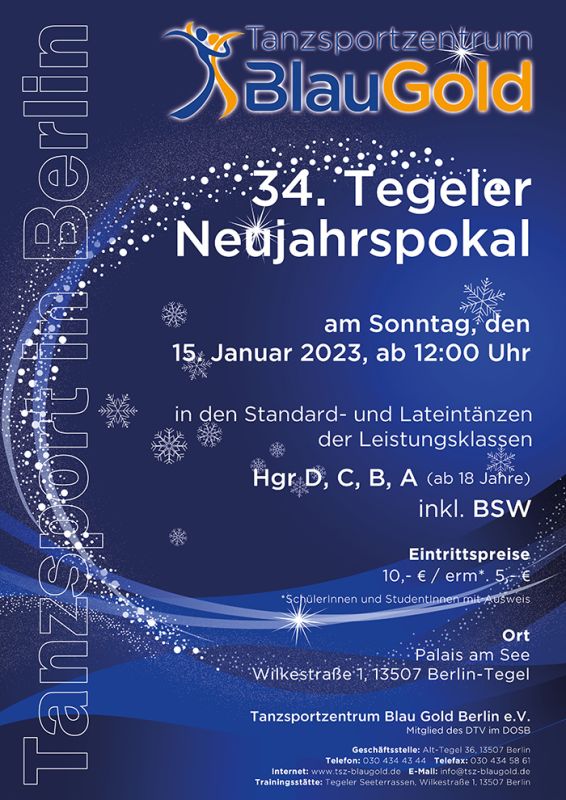 Nach Abschluss der Startmeldungen ergeben sich für den Tegeler Neujahrspokal am 15. Januar 2023 (Sonntag) beim TSZ Blau Gold Berlin nachfolgende Startzeiten: