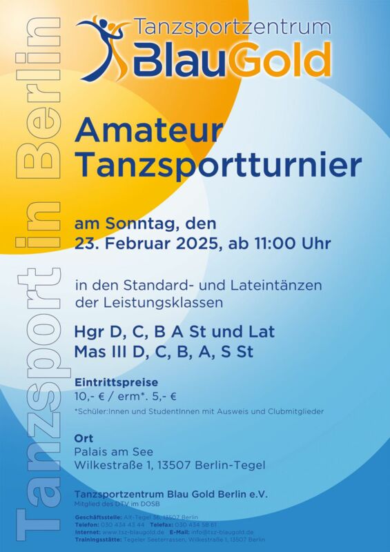 Aufgrund der Meldungen ergeben sich die folgenden Startzeiten für das vom Tanzsportzentrum Blau Gold Berlin e.V. ausgerichtete Turnier am Sonntag, 23.02.25: