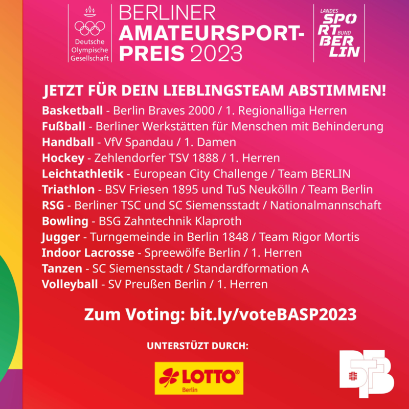 Der LTV Berlin hat das A-Team, die Standardformation, des OTK Schwarz-Weiß 1922 im SC Siemensstadt für den Berliner Amateursport-Preis 2023 nominiert. Jetzt ist es soweit und das Online-Fan-Voting für das "Team des Jahres" ist gestartet. Abgestimmt werden kann noch bis zum 25. Juni 2023 unter diesem Abstimmungslink.