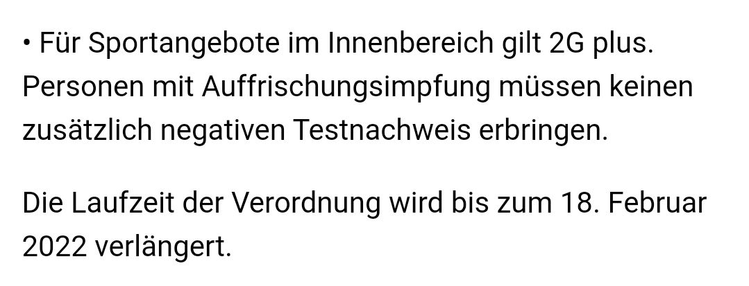 Für Sportangebote im Innenbereich gilt weiterhin 2G plus (also Testpflicht). Personen mit Auffrischungsimpfung müssen keinen zusätzlich negativen Testnachweis erbringen.