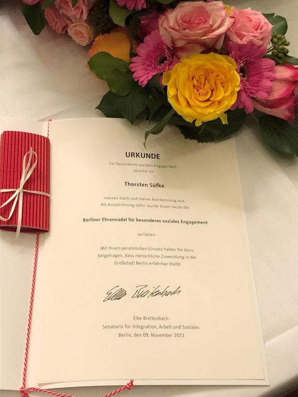 Bereits am 9. November wurde Thorsten Süfke, Präsident des Landestanzsportverbandes Berlin, die Berliner Ehrennadel für besonderes soziales Engagement verliehen. Mit ihm erhielten zwölf weitere Berliner Ehrenamtliche diese Auszeichnung von Elke Breitenbach, Senatorin für Integration, Arbeit und Soziales. Die Auszeichnung wurde im Rahmen einer feierlichen Ehrung im Wappensaal des Berliner Rathauses verliehen und zeichnet Berliner Ehrenamtliche aus, die sich in besonderer Weise für ihre Mitmenschen einsetzen.
