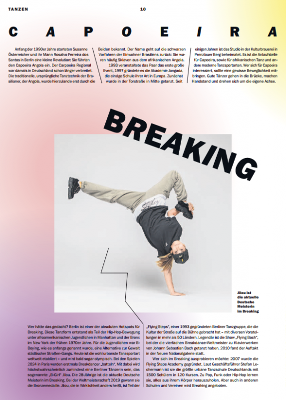 Der Berliner TAGESSPIEGEL hatte im September in einer Sonder-Beilage auch über "Urban Sports" in Berlin berichtet. Und der Tanzsport ist längst so vielfältig, dass er zurecht in dieser Beilage über mehrere Seiten im Mittelpunkt stand. Von Breaking bis Tango Argentino, von Standardtänzen bis hin zu Rock'n'Roll. Lesen Sie selbst..