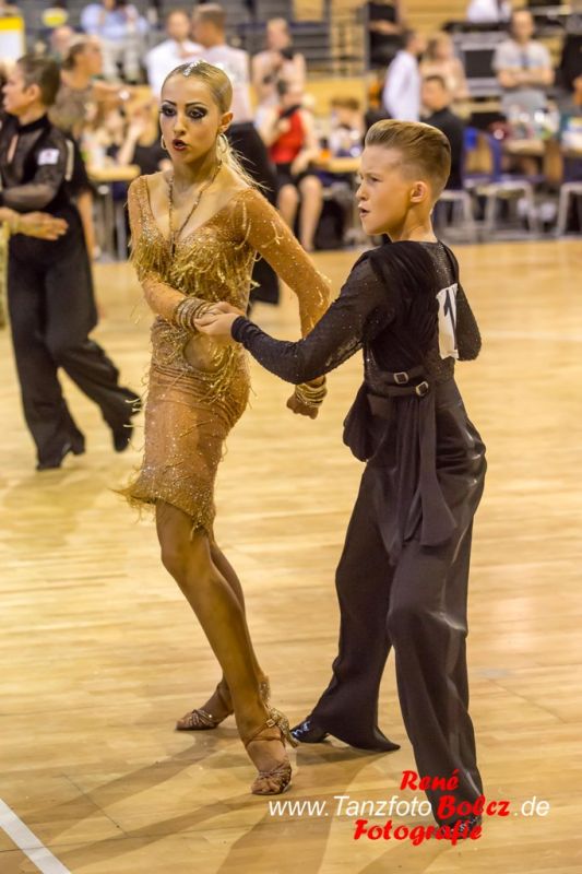 Mit 71 Paaren und damit elf mehr als im Vorjahr startete am Nachmittag das Turnier der Junioren II B Latein. Der Sieg ging hier klar an die Engländer Glenn-Richard Boyce/Kayleigh Andrews, die lediglich den Cha Cha an die späteren Drittplatzierten Ej Giovanni Cena/Enrica Di Maria abgaben. Für die Geschwister Yatsun ging es in diesem Jahr einen Treppchenplatz nach oben. Entschieden wurde die Platzierung erst mit dem Jive. Mit Steven Korn/Katrin Domme auf Platz vier und Shon Burshteyn/Christina Gidikas auf Platz sechs standen zwei weitere deutsche Paare im Finale, das Gedvinas Meskauskas/Beatrice Malinauskaite aus Litauen komplettierten. Im Vorjahr sind die Berliner Efrem Kuzmichenko/Samira Hafez (btc Grün-Gold der TiB 1848) noch knapp am Semifinale gescheitert, tanzten sich die Beiden heute unter die letzten 13 und wurden am Ende Neunte.