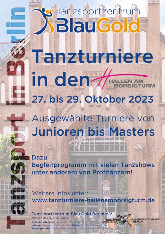 Einmal im Jahr verwandelt sich der zentrale Event-Bereich des Einkaufszentrums „Hallen am Borsigturm“ in eine spektakuläre Turnierstätte und damit in ein absolutes Highlight im Turnierkalender des Landestanzsportverbandes Berlin. Jetzt, von Freitag bis Sonntag (27. bis 29. Oktober) ist es endlich wieder so weit: Das Tanzsportzentrum Blau Gold richtet in Kooperation mit Center-Management die Tanzturniere in den Hallen am Borsigturm aus! Es finden Turniere in den Sektionen Standard und Latein in den Altersklassen der Hauptgruppe sowie der Masters statt.