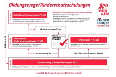Die nach den LSB-Kriterien pro Verein zu bestimmenden Kinderschutzbeauftragten besuchen mit Aufnahme dieser Funktion einen zweitägigen LSB-Workshop (12 LE), der die Grundlagen der Funktion unterrichtet.