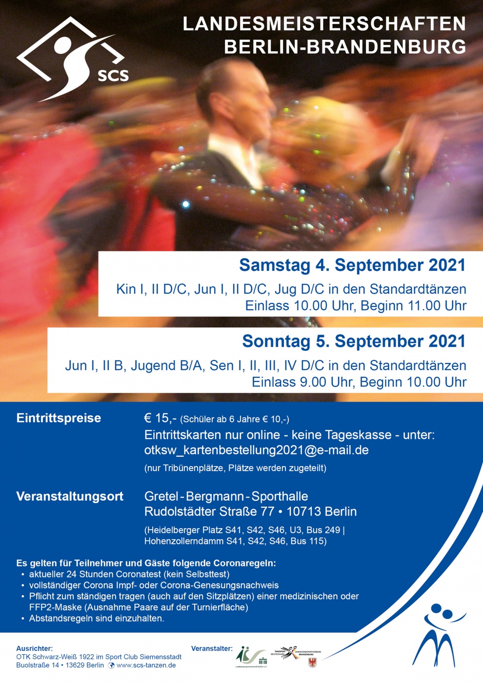 Am 4. und 5. September finden die ersten Landesmeisterschaften Berlin/Brandenburg unter den besonderen Rahmenbedingungen der aktuellen Hygienekonzepte statt. Die LM-Turniere Sa | 04.09. > LM Kin, Jun, Jug D/C Standard So | 05.09. > LM Jun B, Jug B/A, Sen I-IV D/C Standard werden in der Gretel-Bergmann-Sporthalle (Rudolstädter Straße 77, 10713 Berlin) vom OTK Schwarz-Weiß 1922 im SC Siemensstadt ausgerichtet.