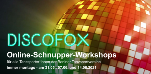 Als ein Teil der Fortetzung von kostenlosen und öffentlichen Angebote für die Mitglieder der Berliner Tanzsportvereine wird ab Ende Mai jeder Montag zum "Discofox-Montag". Drei Online-Schnupper-Workshops gestaltet Michael Putzolu und es sind wirklich alle - von jung bis jünger, Freizeit- und Leistungssportler*innen, herzlich eingeladen.