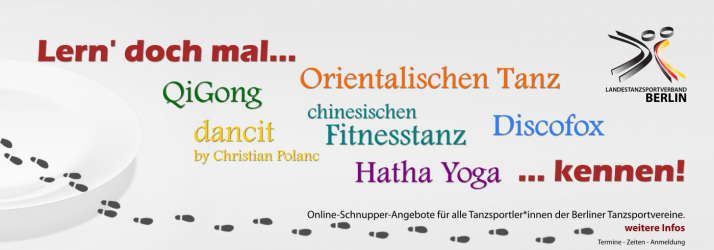 Unter diesem Motto lädt der Landestanzsportverband Berlin alle Tanzsportler*innen – ob Breiten-, Freizeit- oder Leistungssport – der Berliner Tanzsportvereine zu Online-Schnupper-Angeboten ein. Kennen Sie schon QiGong, Single dance - dancit, Hatha Yoga, Orientalischen Tanz oder Chinesischer Fitnesstanz? Dann haben Sie ab Mitte Mai die Gelegenheit einmal reinzuschnuppern, was die Berliner Tanzsportvereine noch so alles zu bieten haben.
