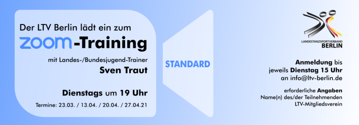 Seit Mitte Februar lädt der Landestanzsportverband Berlin wöchentlich alle Berliner Tanzsportler*innen zu einem Online-Training Standard via Zoom ein. Jeden Dienstag abend kann nach vorheriger Anmeldung an der Trainingsstunde mit unserem Landestrainer für die Standardtänze, Sven Traut, teilgenommen werden. Dieses wöchentliche Online-Training wird am 23. März letztmalig vor Ostern stattfinden. Nach den Osterferien geht es dann weiter...