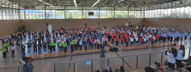 Und dann wurde getanzt - in zwei Klassenstufen-Kategorien und auf zwei Flächen parallel. Nach einer Vorrunde aller Gruppen qualifizierten sich die jeweils sieben besten Teams für die jeweiligen Finals. Aber vorher wurde erstmal gemeinsam getanzt . Kristina Seele, die Choreographin der diesjährigen Choreo zum Song "Simple Life" von Leony, hatte für die Schüler noch einige gemeinsame Tänze dabei und so füllte sich der Halleninnenraum ganz schnell (siehe Foto).