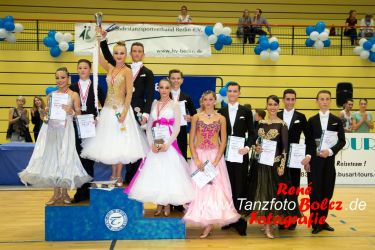 Das Treppchen der Hauptgruppe B war fest in der Hand des Tanzsportzentrums Blau Gold. Hier tanzten sich Phillip Kaiser/Clara Hendel in ihrem ersten gemeinsamen Turnier zum Meistertitel. Platz zwei ging an Stefan Wanckel/Irina Günther, die mit dieser Platzierung in die A-Klasse aufstiegen.